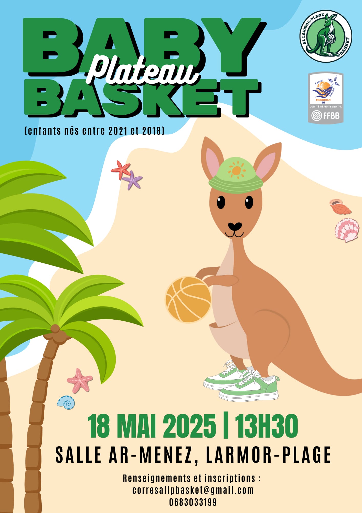 Ce dimanche, la section Basket-ball de l’Amicale Laïque de Larmor-Plage organisait un plateau Baby Basket à la Salle Ar Menez, réunissant près de 50 enfants âgés de 4 à 7 ans. Animés par une équipe de bénévoles dévoués, joueurs et parents, les jeunes participants ont découvert le plaisir du jeu à travers une série d’ateliers ludiques sur le thème « Kangou à la Plage ».